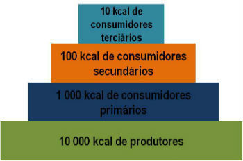 O fluxo de energia, através da cadeia alimentar, diminui em direção aos níveis tróficos mais altos. Assim, a energia diminui da base para o topo, porque parte da energia é incorporada por cada nível trófico e outra parte dissipada em forma de calor.