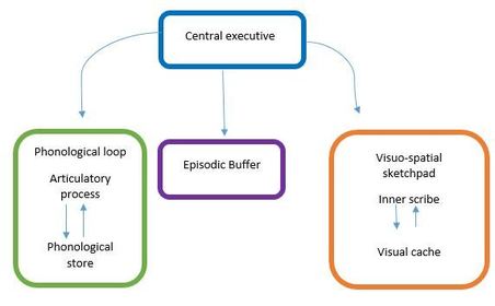| Visuo-spatial sketchpad | Stores visual information Inner scribe: spatial relationships Visual cache: colour, size and shapes |