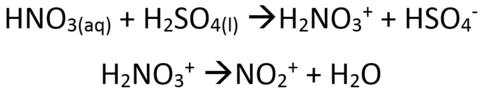 | Nitration of benzene reaction and conditions | Benzene w/ conc. nitric and sulpuric acid Produces nitrobenzene and water 50 degrees |