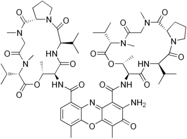 | Dactinomycin Við sérstökum æxlum í börnum se: Mergbæling og vefjaskemmd við stungustað Phenoxazone-hlutinn intercalerar við DNA og hindrar topoisomerasa II = engin afritun, engin fjölgun. | |