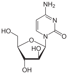 | Cytarabine Pýrimidín andmetabólíti Er umbreytt í trífosfat og sett inn í DNA í stað Cytidín eða þegar CTP verður dCTP sem á að fara inn í DNA er Cytarabine sett inn í DNA og það stöðvar nýmyndun. Notað við bráðahvítblæðis | |