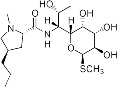 | Lincomycin Línkósamíði, fúkalyf, úr Streptomyces. Mjög eitrað og miklar aukaverkanir svo lítið notað í dag, nema um sé að ræða ónæmi eða ofnæmi, þá er mögulega gripið til þess. Klindamycin er afleiða Loncomycin sem er mun betra lyf. | |