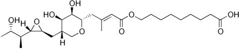 | Mupirocin bygging Hópur skyldra fúkalyfja, einangrað úr Pseudomonas florescens. Klofnar hratt af esterösum í líkamanum, einungis notað ÚTVORTIS, virkt á g + og - cocca. VERKUN: hindrar RNA- og próteinmyndun í sýklum. Það binst ensími ( isoleucil transfer-RNA synthasa ) og kemur í veg fyrir innsetningu isoleucins í prótein. Ónæmi myndast og berst með plasmíðum sem gerir lyfinu ókleyft að bindast ensíminu eða lyfinu ekki hleypt inn í sýkil. Ábending: Húðsýkingar, útbrot, blöðrur ofl. Smyrsli og nefsmyrsli. | |