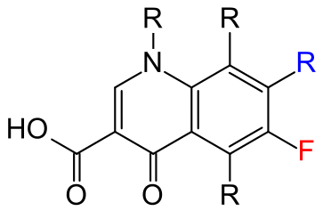 | Kínólónar Nauðsynleg bygging flestra Kínólóna sýklalyfja, Blái R-hópur er oftast Piperazín og F eykur best virkni, en aðrir halógenar sjást líka. Uppgötvaðist að óhreinindi (nalidixin sýra) við framleiðslu malaríulyfsins chloroquine höfðu sýkladrepandi verkun. Þessi lyf mynda háan styrk í þvagi og voru því upphaflega notuð við þvagfærasýkingum. Nýrri kínólónar hafa mun víðtækari notkunarsvið. | |