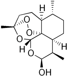 | Dihydroartemisinin Umbrotsefni Artemisinin Malaríulyf p.o. Gefið í compi therapy Hlutsmíðað afbrigði af Artemisinin, sem er sesquiterpen laktón með peroxíð brú sem er nauðsynleg fyrir verkun. MOA ekki alveg þekkt en talið vera radikalar sem drepa frumdýrið | |