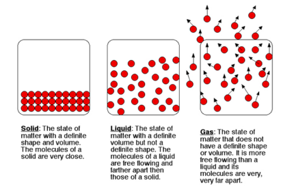 | States of matter | Everything around us is made of three states - solids, liquids, gases. Solids have no flow, a fixed volume, a fixed shape, and a much higher density than gas. Liquids can flow, have a fixed volume, they take the shape of a container and have a much higher density than gas. Gases flow, fills a container, the volume can be changed and have low density compared with liquids and solids. |