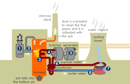 | Inside a power station | Almost all generated electricity is from power stations. In coal or oil fired power station and in most gas fired power stations the burning fuel heats water in a boiler which produces steam. The steam drives a turbine that turns an electrical generator. Coal, oil and gas are fossil fuels, which are fuels obtained from long-dead biological material. In some gas-fired power stations we burn natural gas directly in a gas turbine engine. This heats the air drawn into the engine, it produces a powerful jet of hot gases and air that drives the turbine. Gas-fired turbine can be switched on very quickly. |