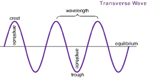 | Measuring waves | Must measure waves if want to find out how much energy or information they carry. The crests or peak are at the top of the wave, the troughs are at the bottom, they are equally spread. The amplitude of waves is the height of the wave crest or depth of wave trough from the middle - position of rest. The larger the amplitude the more energy the wave carry. Wavelength of waves is distance from one wave crest to next crest, its one complete wave. |