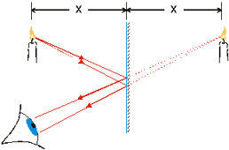 | Image formation by a plane mirror | Ray diagram shows path of two light rays from a point object that reflects off the mirror, the image an object at equal distances from the mirror. |
