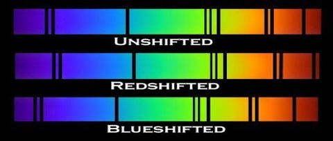 | Red-shift | Can found out lot of stars and galaxies by studying light from them, can use a prism to split the light into a spectrum. Wavelength of light increases across the spectrum from blue to red can tell its spectrum if a star or galaxy is moving towards or away from us, as: Light waves are stretched out if star or galaxy is moving away from us. Wavelength of waves is increased, call this red-shift as spectrum of light is shifted towards the red part of the spectrum. Lightwaves are squashed together if the star and galaxy is moving towards us, wavelength of the waves are reduced, call this blue-shift as the spectrum of light is shifted towards the blue part of the spectrum. Dark spectral lines caused by absorption of lines by certain atoms like hydrogen that make up star or galaxy. Position of lines tells us if there is a shift and if so whether red-shift or a blue-shift. The bigger the shift the more the waves are squashed together or stretched out so the faster the galaxy must be moving towards or away from us. Faster a star or galaxy is moving (relative to us) the bigger the shift. |