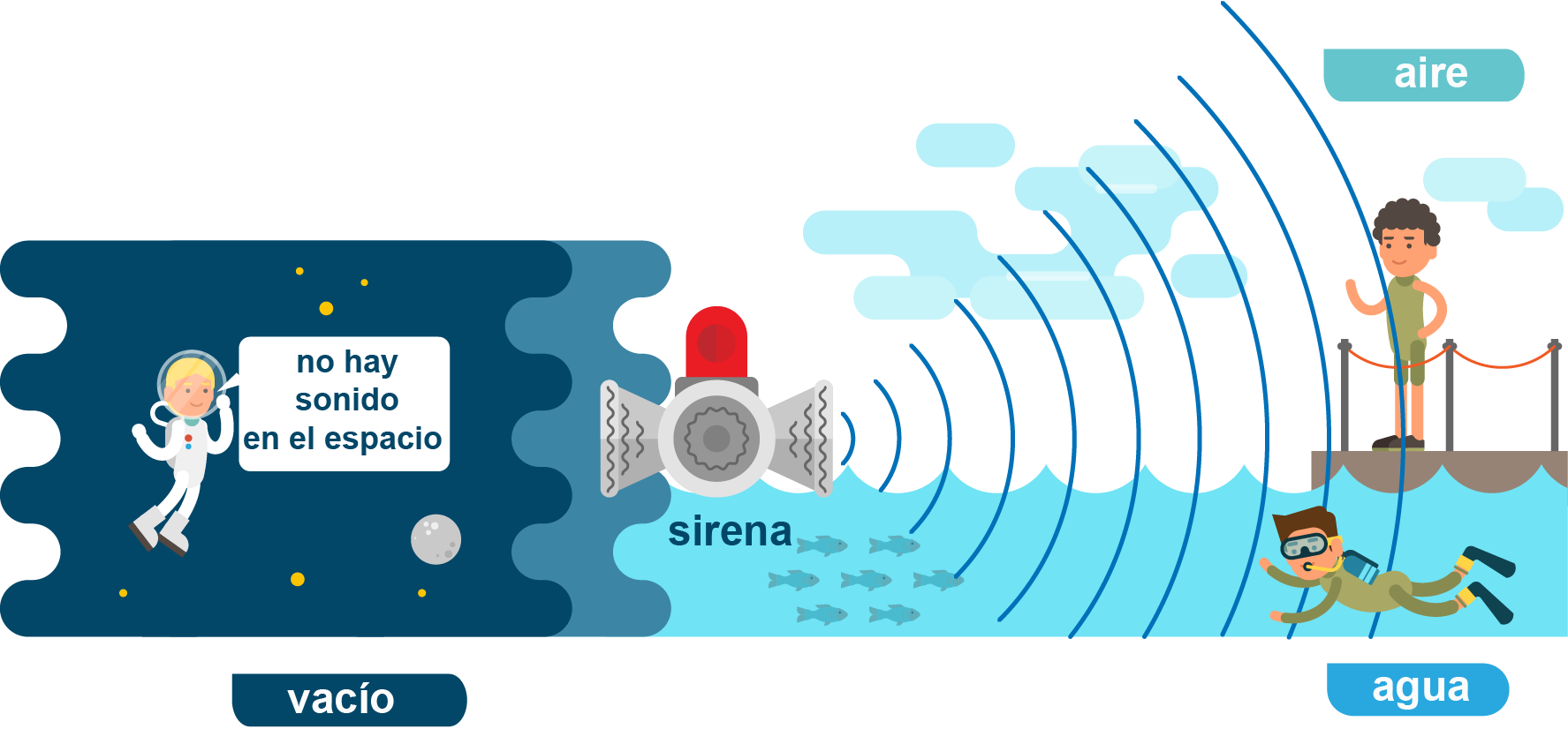 | ¿CÓMO SE TRANSMITE EL SONIDO? A través de un medio material, como el aire, el agua. (No puede propagarse en el espacio) |