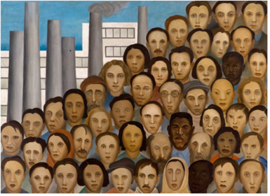 | TARSILA DO AMARAL Obra: Operários - 1933 Depois de uma viagem para Moscou, onde fez uma Exposição em 1931, Tarsila voltou sensibilizada com a causa operária no mundo e também no Brasil, pintou a majestosa obra "Operários" em 1933, a primeira de cunho específico social no Brasil. | |
