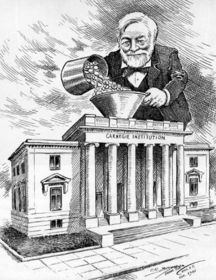 | Andrew Carnegie | The face of the saying "Rags to Riches". He started out as a poor scottish immigrant and became a captain of industry through the production of steel. He wanted to help people with his wealth and built over 2500 libraries and schools. The picture shows him pouring tons of money into Carnegie schools |