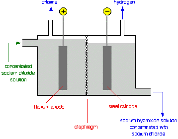 | Describe the electrolysis of brine in a diaphragm cell | |