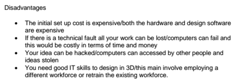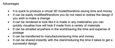 | Designers can make use of Computer Aided Design (CAD) software to produce virtual Explain the advantages and disadvantages of using CAD for virtual modelling instead of models of their designs. traditional modelling techniques. | |