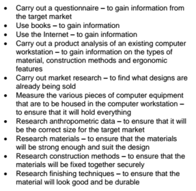 | Suggest two different types of research that the designer will need to carry out. In each case explain why it is necessary to carry out this type of research. when designing the computer workstation. | |