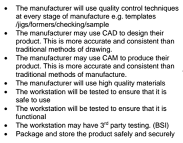 | Describe the various methods that a manufacturer would use to ensure that the consumer receives a high quality product. | |