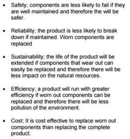 | Explain why a designer should consider the importance of maintenance when designing products. | |