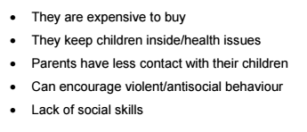 | Designers and manufacturers must be aware of the social and moral implications of their products. Give three reasons why computer games are considered by some parents to be socially irresponsible products. Explain each of your answers. | |