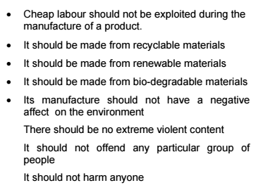 | Give three social, moral or environmental factors that manufacturers must consider to ensure that their products will be acceptable. Explain your answers. | |
