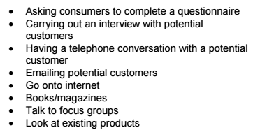 | Before a product is designed it is useful to carry out market research. List three different methods of carrying out market research. | |