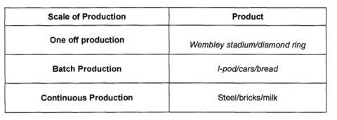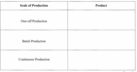 | Give an example of a product that is made by each of the given scales of production. | |