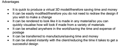 Designers can make use of Computer Aided Design (CAD) software to produce virtual models of their designs. Explain the advantages and disadvantages of using CAD for virtual modelling instead of traditional modelling techniques. | |