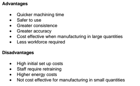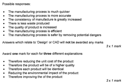 Give three advantages of using CAM (Computer Aided Manufacture) equipment to manufacture products. | |