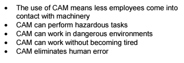 Give three ways in which the use of CAM (computer aided manufacture) has improved safety within the industrial workplace. |