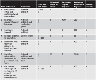 | Name 6 Major project tasks in WBS | *Work to be accomplished *Assignees *Start and end dates *Amount of effort required *Estimated capital and noncapital expenses *Identification of dependencies between/among tasks |