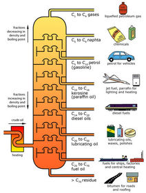 | Crude oil is split into separate groups of hydrocarbons The fractionating column works continuously with heated crude oil piped in at the bottom. The vaporised oil rises up the column and the various fractions are constantly tapped off at the different levels where they condense | |