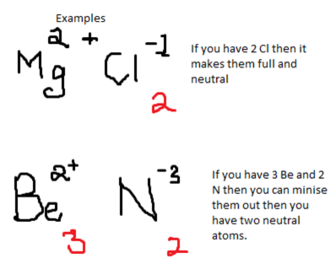 | What is the cross over rule? | 1.Write the symbol 2.Write the charges 3.Cross over the charge from top to bottom 4.Remove the charges 6.Simplify the number and remove the 1’s |