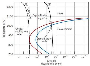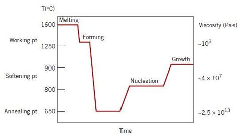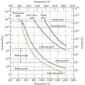 | Melting Point: [10Pas] Glass is considered liquid Working Point: [10^3 Pas]Glass is easily deformed Softening Point: [10^5 Pas] Maximum temperature where glass can be held without deformation Annealing Point: [10^12 Pas] Atomic diffusion sufficient to remove residual stresses in 15 minutes Strain Point: [3 E 13 Pas] Maximum temperature where fracture occurs before any deformation | |