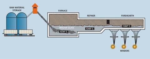 | Drawing | Molten glass is refined and then passed into channels containing forehearths with platinum dies containing multiple orifices. The molten glass is extruded through the dies to form fibres and wound on spools which rotate faster than the fibre feed rate resulting in tension and attenuation of fibres. Similar procedure for tubes and rods. |