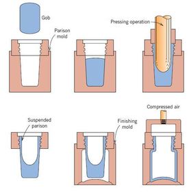 | Blow Moulding | Gob of glass is pressed into parison (temporary shape). The parison is then placed inside a two-part finishing mould and the glass is forced to take the final desired shape by compressed air. Products include bottles and jars. |