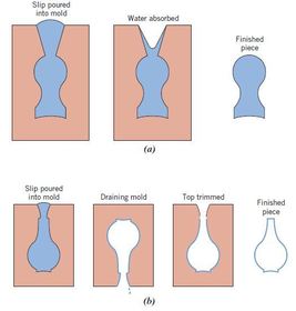| Slip Casting | Slip is a suspension of clay and non-plastic materials in water. Poured in a porous mould made from plaster of paris, which absorbs water from slip leaving behind a solid layer on mould wall, with thickness depending on time. a. Solid casting: Process is continued until the finished piece is solid b. Drain casting: Process is continued until the desired thickness is achieved. The mould is dissassembled and the part is dried, fired and glazed to increase strength and seal pores respectively. |