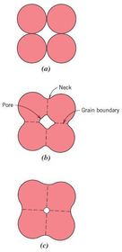 | Sintering | After pressing, the piece is heated to the melting temperature so that particles can coalesce into a dense mass and improve mechanical strength by reducing porosity. Necks form along the contact regions between adjacent particles, grain boundaries form within each neck and interstices between particles form pores which become smaller and more spherical during the sintering process. |