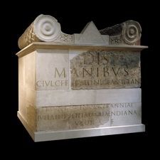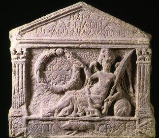 | Tomb of Aurelia Aureliana Carlisle Romano-British tomb pine cones = life Poppies = sleep Wearing the Birrus Britanicus | |