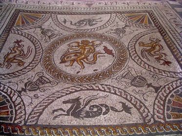 | Dolphin and Cupid Mosaic Fishbourne Pallace Seahorses and sea panthers surround the central circle | |