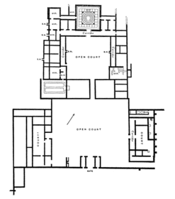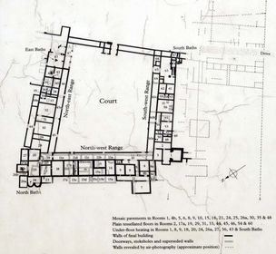 | Woodchester Villa - Gloucestershire Double courtyard Great Pavement Mosaic Marble statues - Diana Luna, Cupid, Psyche -room 25 2 possible bath houses Monumental gate entrance | |
