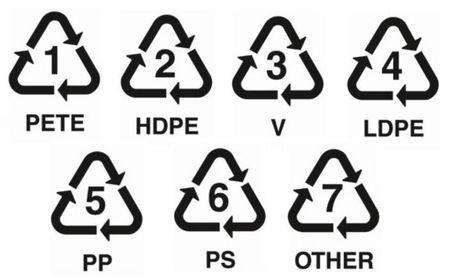 | These symbols are found on the 7 most commonly used plastics: Polyethylene Terephthalate, High Density Polyethylene, Polyvinyl Chloride, Low Density Polyethylene, Polypropylene, Polystyrene and other. They signify that the product is recyclable, and speed up sorting at the recycling plant. | |