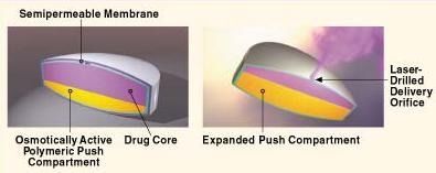 | Describe the design of an OROS controlled release tablet (type used in Adalat OROS) | |