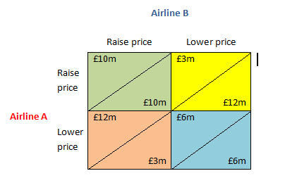 | For example if Airline A raises their price and Airline B follows they will both win because the payoff is £10m. However if Airline B doesn't follow and instead lower its prices it will have a payoff of £12m but if both decide to lower their prices both lose on revenue at £6m | |