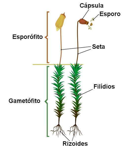 | Estrutura das briófitas que se forma após a fecundação. Produz esporos. | Esporófito. |