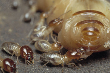 | Trabalhadores de cupins Macrotermes Michaelseni coleta de ovos da rainha. | |