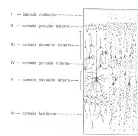 Enumere as 6 camadas histológicas do córtex cerebral. | I — camada molecular II — camada granular externa III — camada piramidal externa IV —camada granular interna V — camada piramidal interna (ou ganglionar) VI —camada de células fusiformes (ou multiforme) |