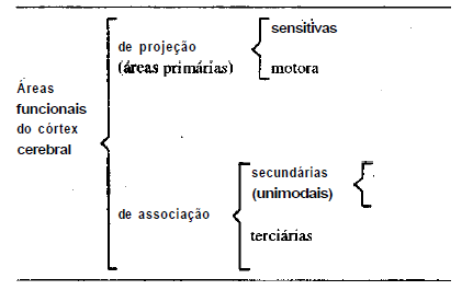 Qual a divisão de áreas funcionais do córtex cerebral? | Áreas de projeção: Recebem ou dão origem a fibras relacionadas com motricidade ou sensiblidade. Áreas de associação: As demais. Relacionadas com funções psíquicas complexas. |