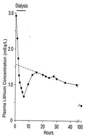 | Explain what is happening here | patient who has high levels of lithium in body undergoes haemodialysis (marked by lack line at top). Haemodialysis is removing drug from blood. When HD is ceased, because removal of drug from blood was so rapid, the drug has to re-equilibrate from tissues and we see a rise in lithium blood levels again |