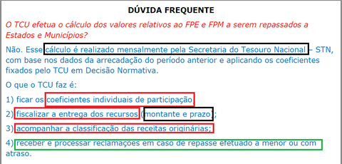 | QTO AO FPE e FPM O Q O TCU AZ? | 4- RECEBER E PROCESSAR RECLAMAÇÕES EM CASO DE REPASSE EFETUADO A MENOR OU COM ATRASO |