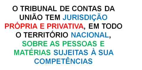 | TCU TEM JURISDIÇÃO PRÓPRIA? | LEI ORGÂNICA O TCU POSSUI JURISDIÇÃO PRÓPRIA E PRIVATIVA. SUAS DECISÕES NÃO PODEM SER REVISTAS PELO JUDICIÁRIO |